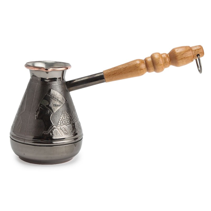Турка емкостью 0,3 л оригинального дизайна, декорирована рельефным изображением египетского орнамента. Изготовлена из высококачественной меди, с деревянной ручкой.